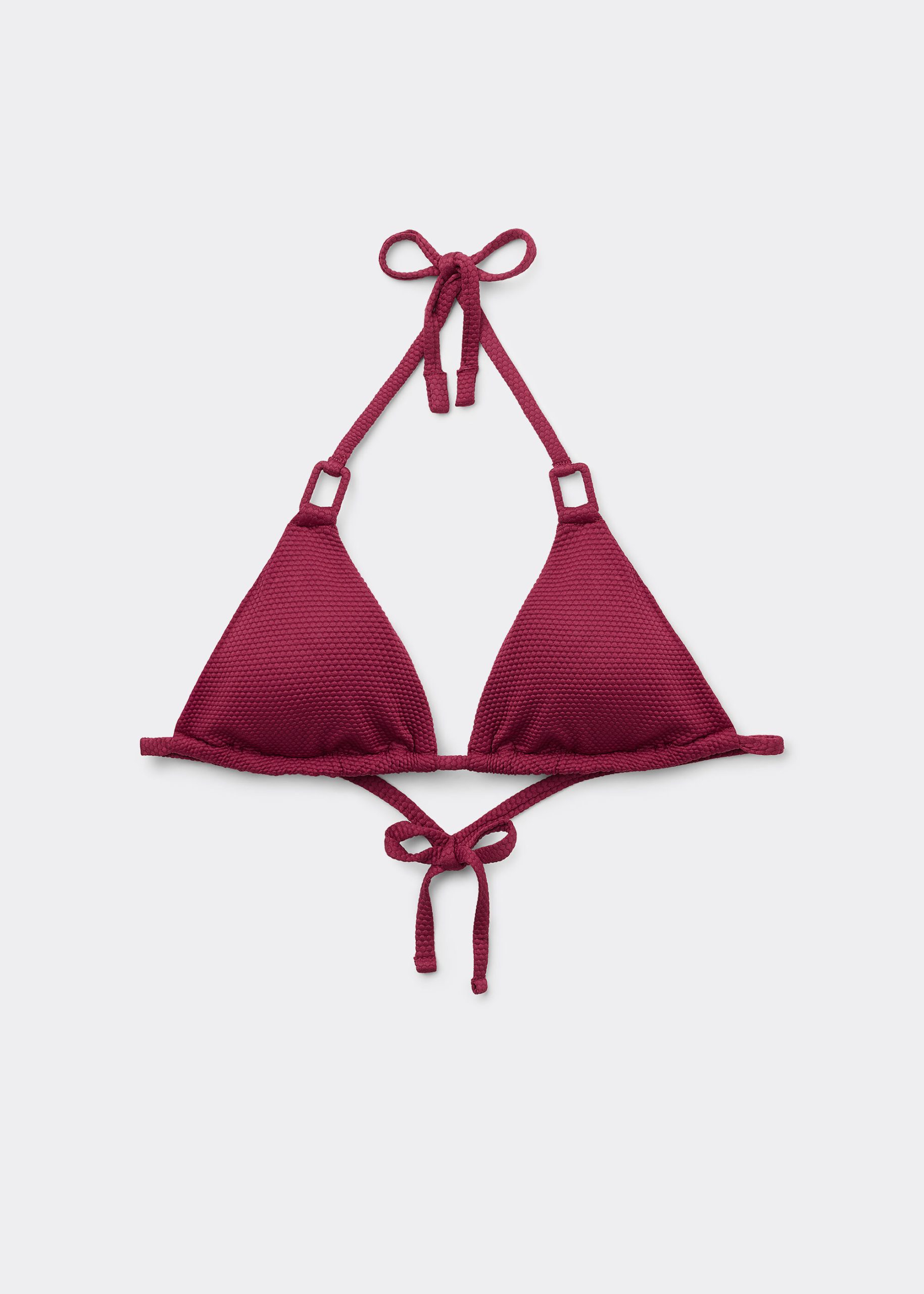 Slide triangle bikini top with removable padding, wireless for a natural effect. The elegant and hard-wearing piqué fabric with its distinctive texture is embellished by a chic accessory that further exalts the style. The shoulder straps have eyelets on the ends so they can be hooked onto the back band or tied behind the neck. Back string tie closure.