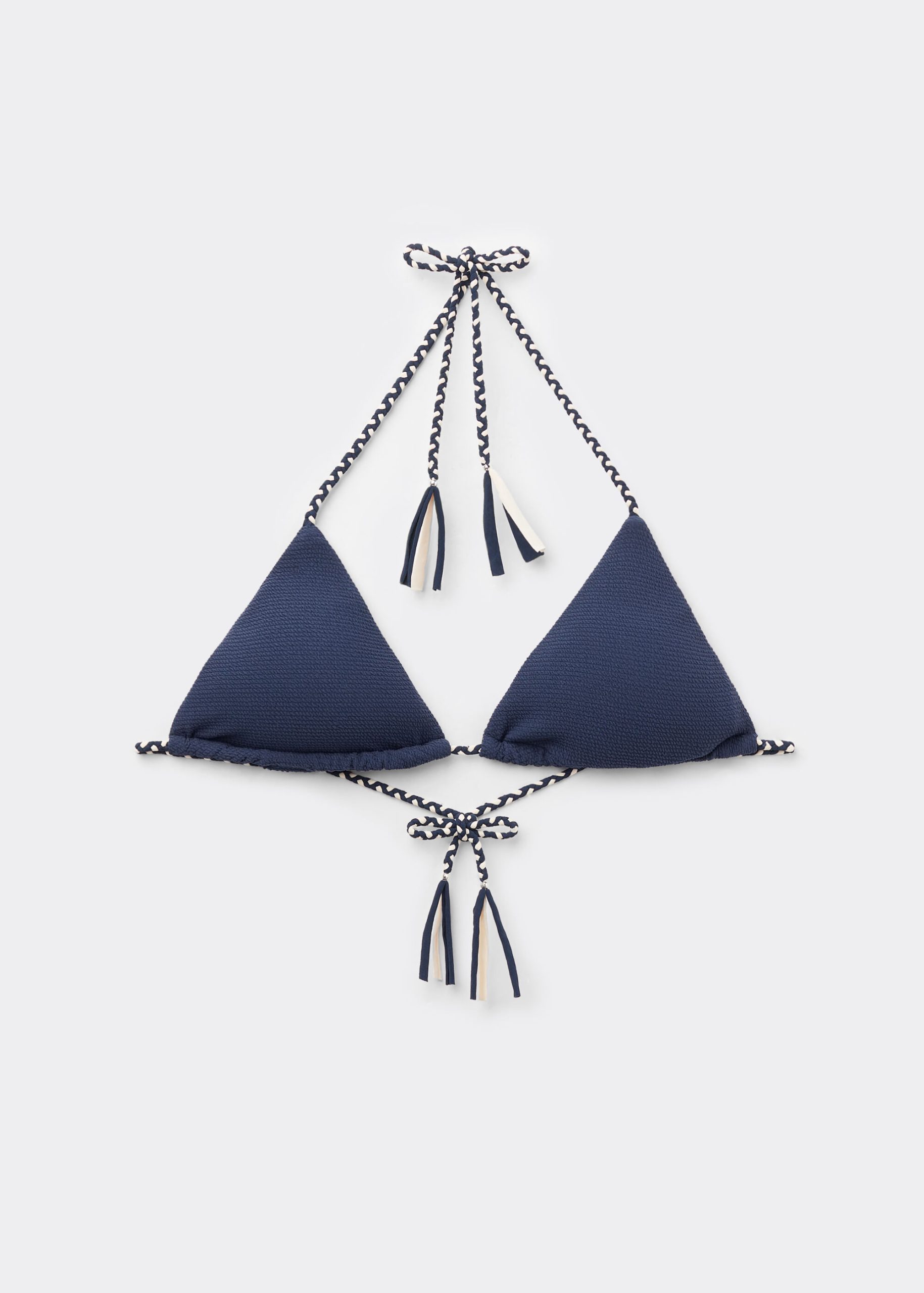 Slide triangle bikini top with removable cups and no underwire for a natural effect. The style is defined by a three-dimensional monochrome fabric with a slightly crinkled texture that adds depth and sophistication. The shoulder straps and the back string tie closure feature a two-toned braid.